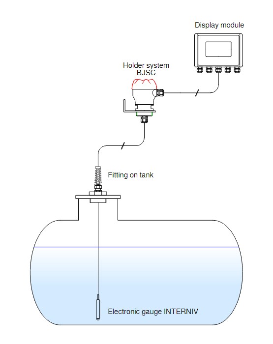 A complete measuring system includes: - 1 Gauge INTERNIV - 1 Display module: BAMOWIZ: Digital and graphical display (data-sheet 217-01) ITU: Versatile indicator (data-sheet 222-04) BMG 72: Galvanometric indicator (data-sheet 206-01) - 1 Tank fitting, and, 1 holder