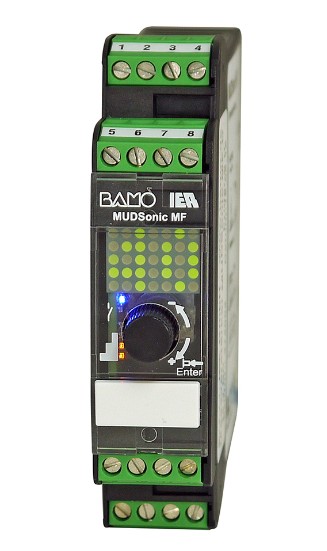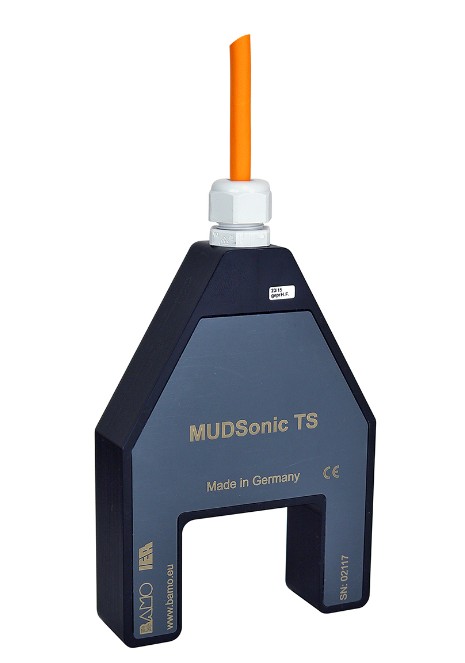 The MUDSonic sludge level monitoring system consists of the MUDSonic MF control unit combined with the MUDSonic TS immersion probe. Measurement is based on the principle of ultrasonic absorption. The probe detects the solids concentration in the medium using multiple ultrasonic signals. The immersion probe is installed at a defined height in the medium and switches a limit value when the selected sludge density is reached. The switching point and any required delay time are set on the control unit.