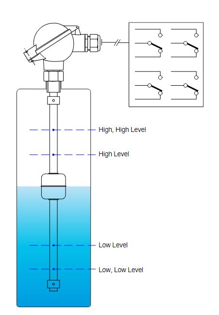 The Reed contacts (up to 4) inside the stem, are actuated directly by the magnet float. Wet parts (stem and float) to choose between: or PVC & PP, or PP, or PVDF
